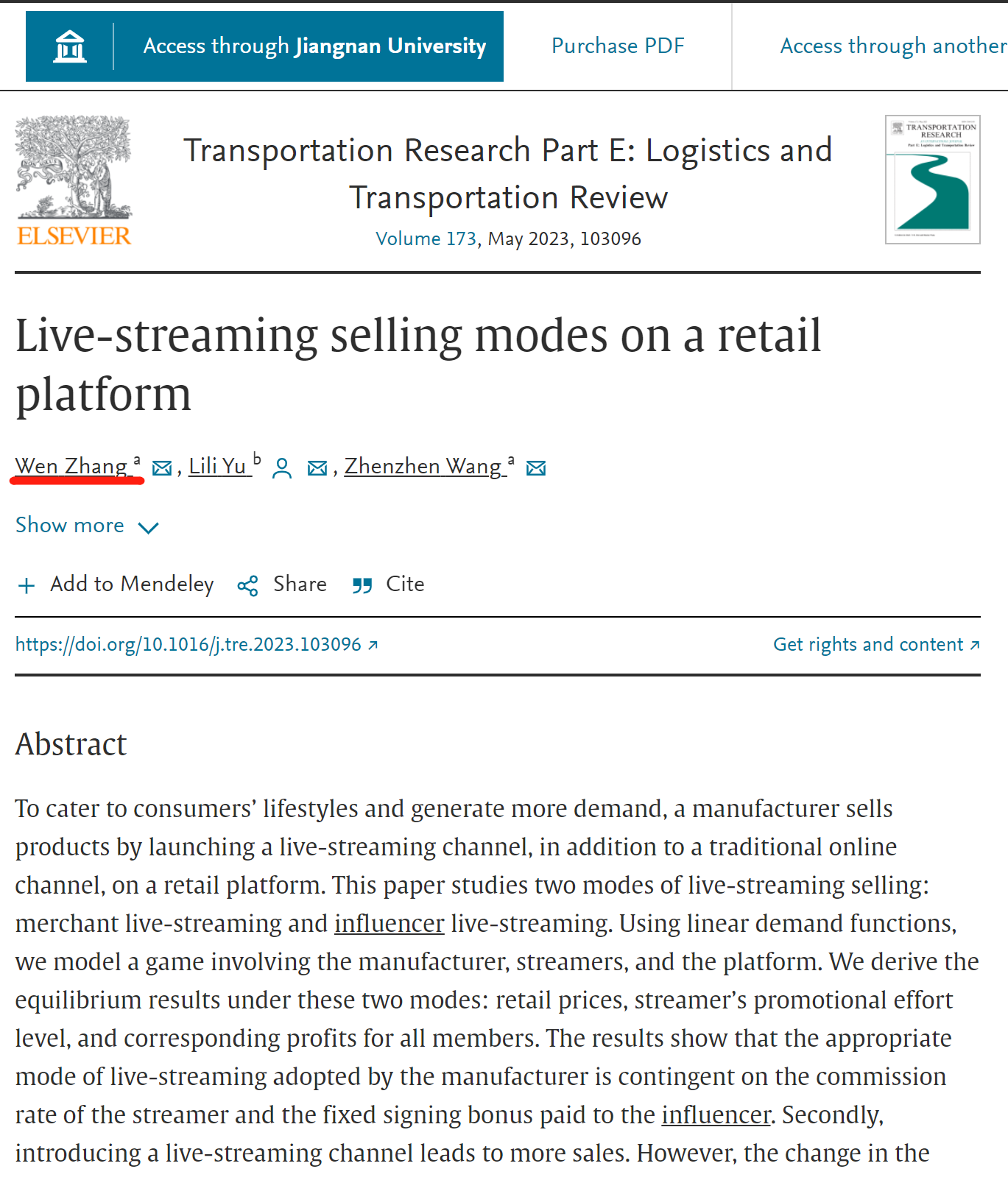 近日,永利官网张文博士与中国科学技术大学特任副研究员于莉莉以及yl7703永利官网研究生王臻臻合作的论文“Live-streaming selling modes on a retail platform”在管理学领域国际权威期刊《Transportation Research Part E: Logistics and Transportation Review》正式刊出。Transportation Research Part E: Logistics and Transportation Review是SCI,SSCI双检索期刊,影响因子10.047,中科院一区top,ABS三星级期刊,FMS管理科学高质量国际B类期刊。